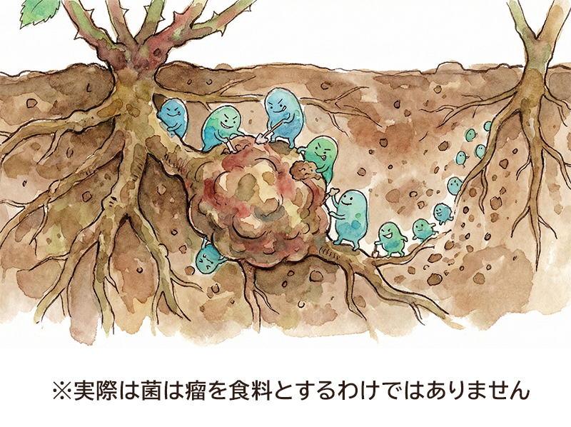 酷い場合は豪華に咲き誇っていた庭のバラたちが次々と枯れていき、掘り上げると瘤がたくさん出てきたというような悲劇は日常的に起こっています。