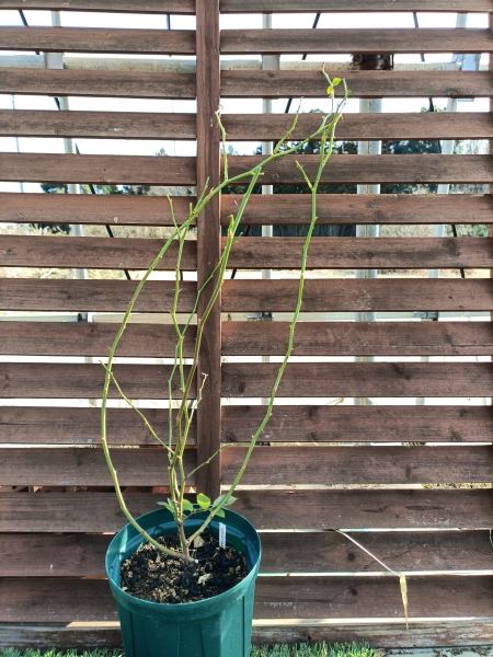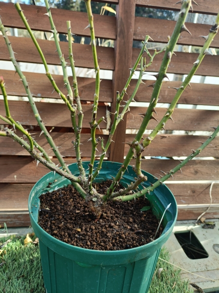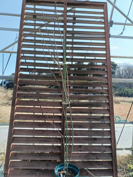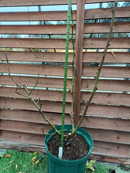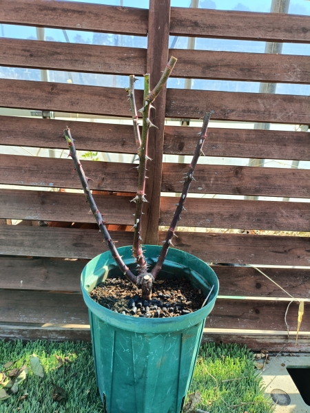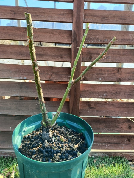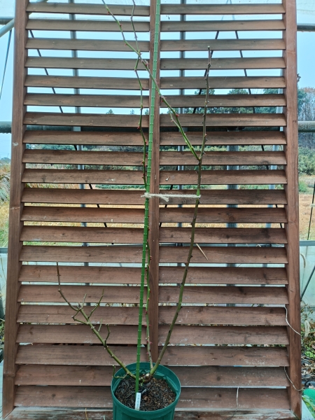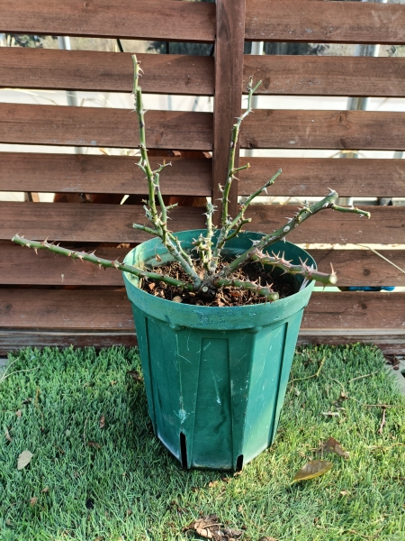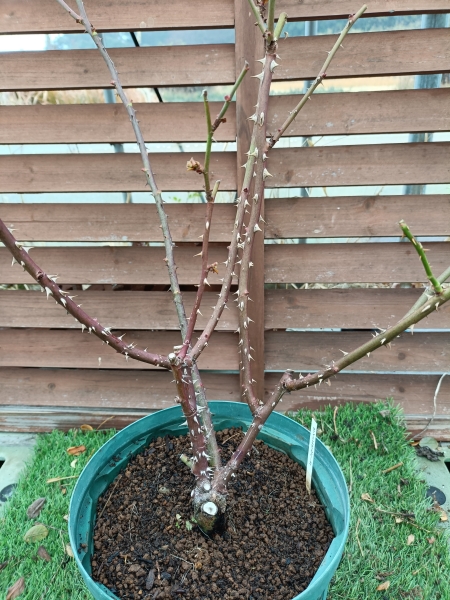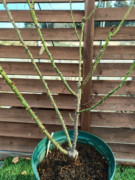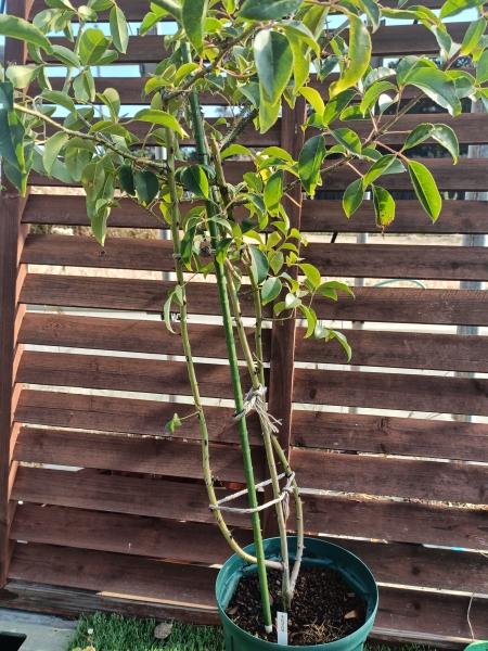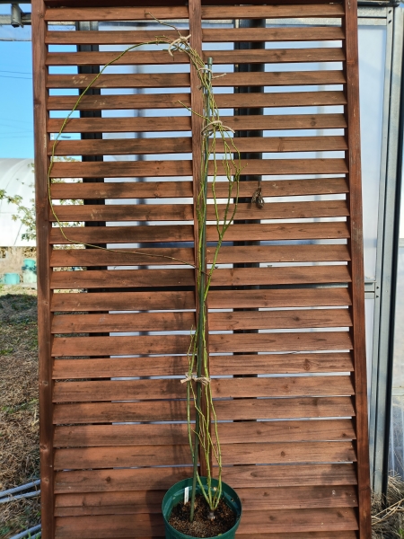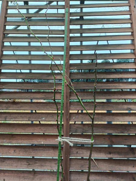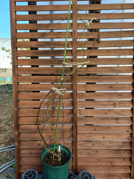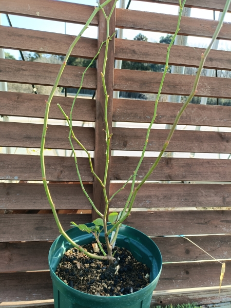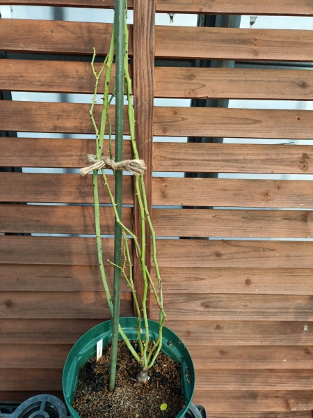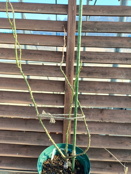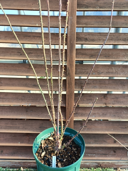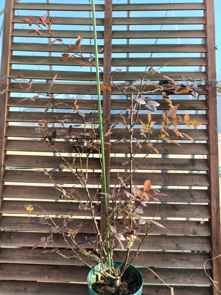 親木として2年ほど育てた苗です。細めの枝はトゲがなく、扱いやすいつるバラです。返り咲き性があり、枝を伸ばしながらちょこちょこと花を咲かせてくれます(12月21日撮影)