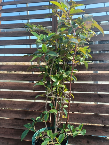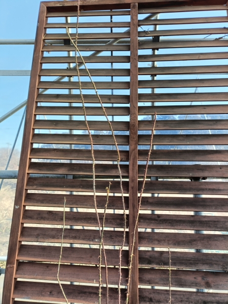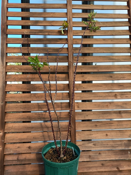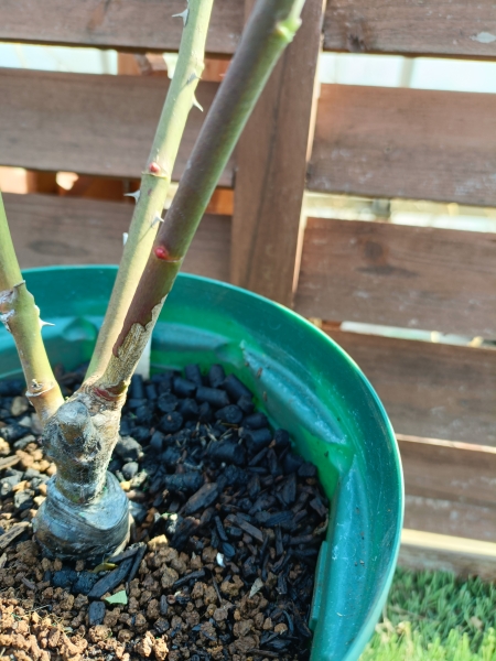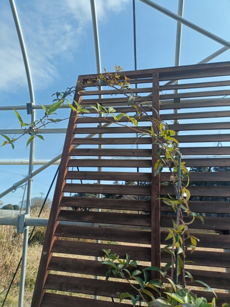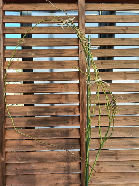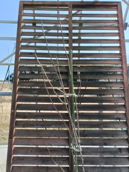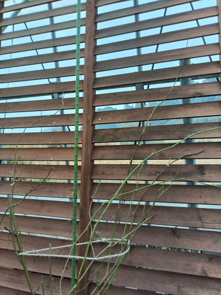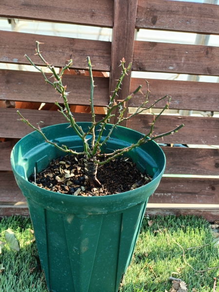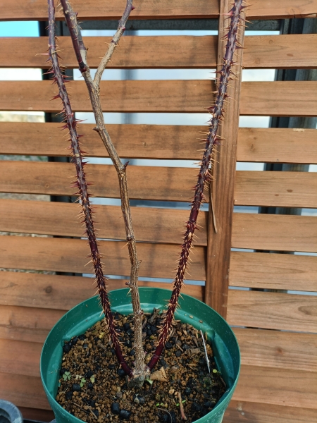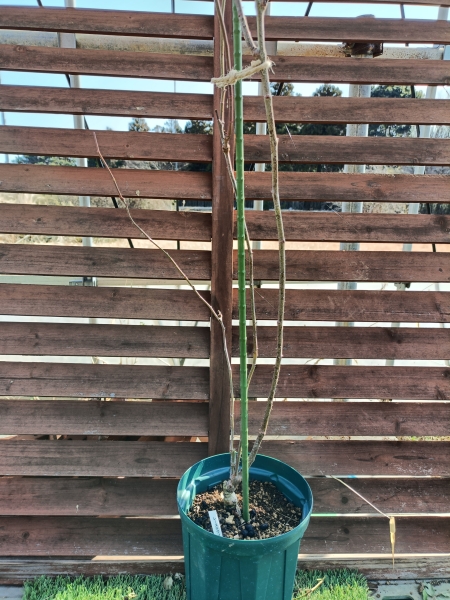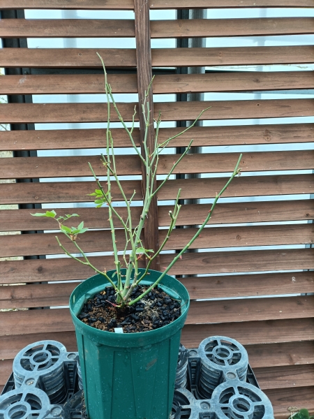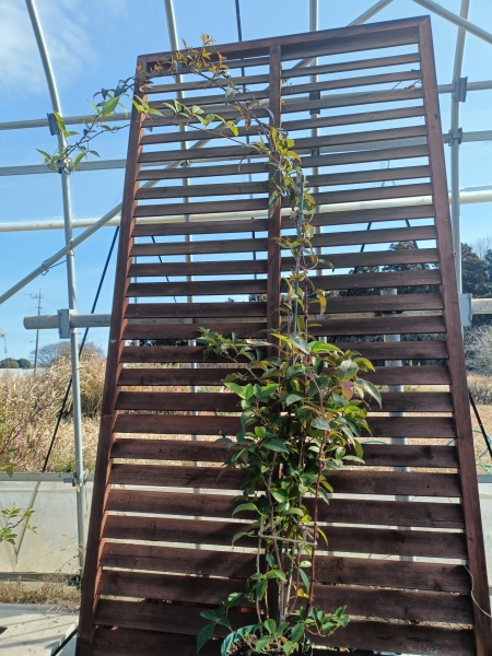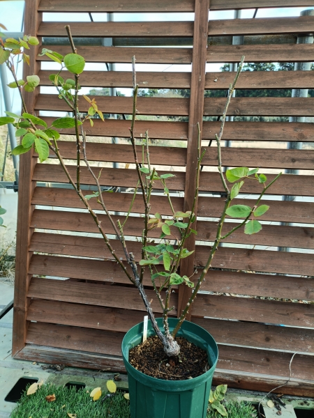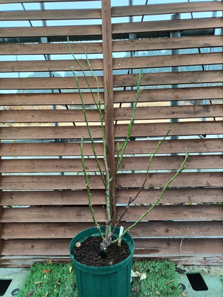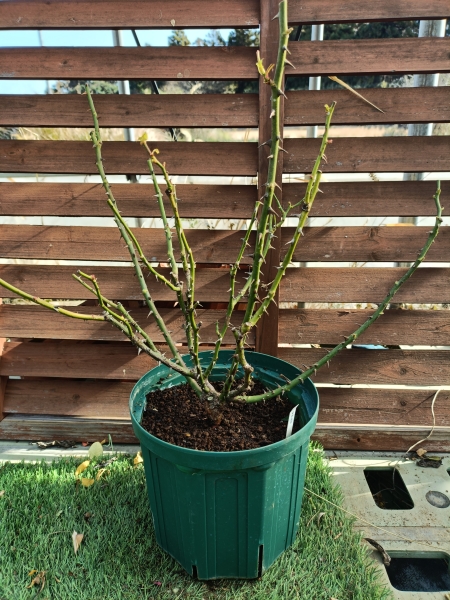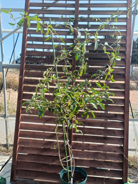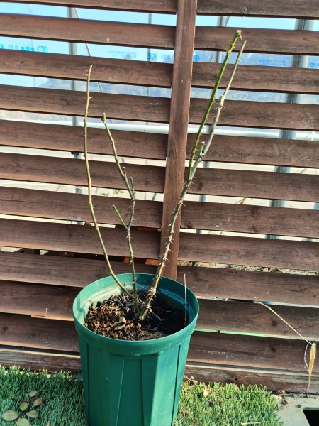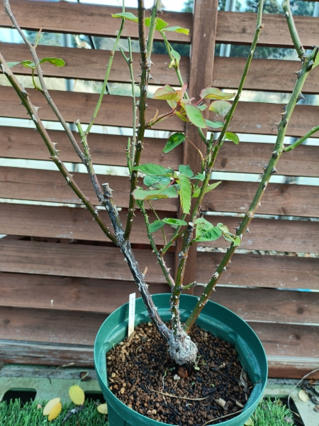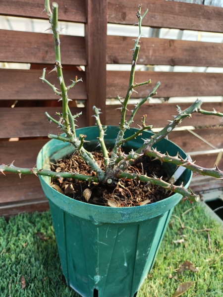 親木として2年ほど育てた苗です。細めの枝はトゲがなく、扱いやすいつるバラです。返り咲き性があり、枝を伸ばしながらちょこちょこと花を咲かせてくれます(12月21日撮影)