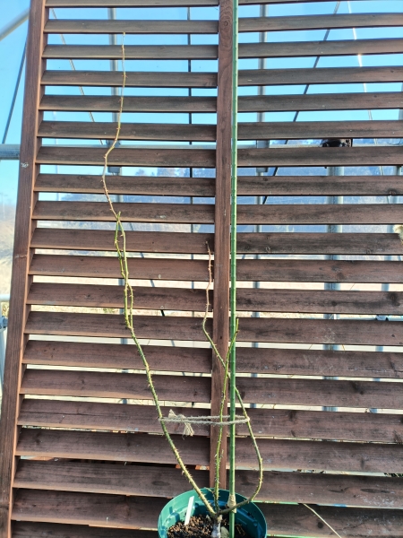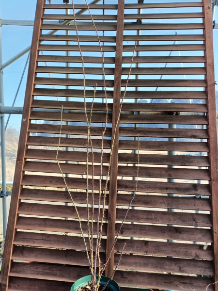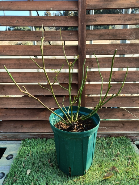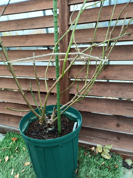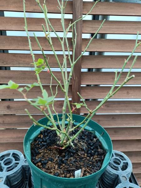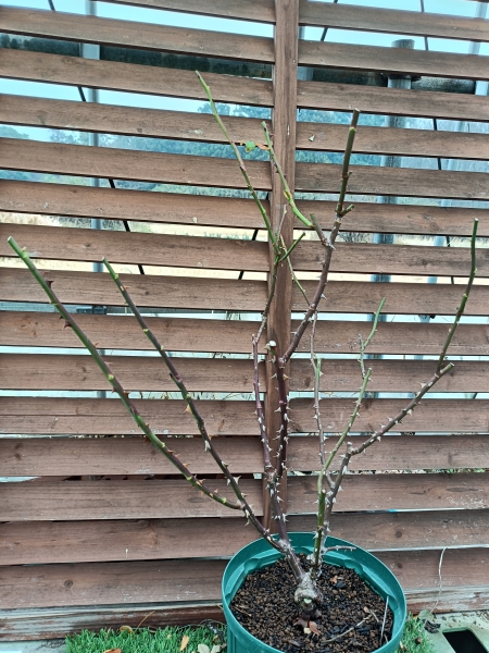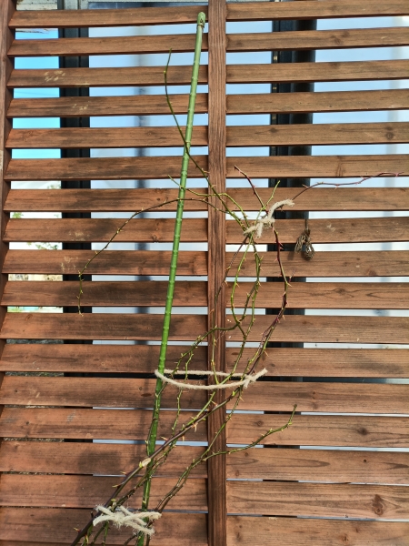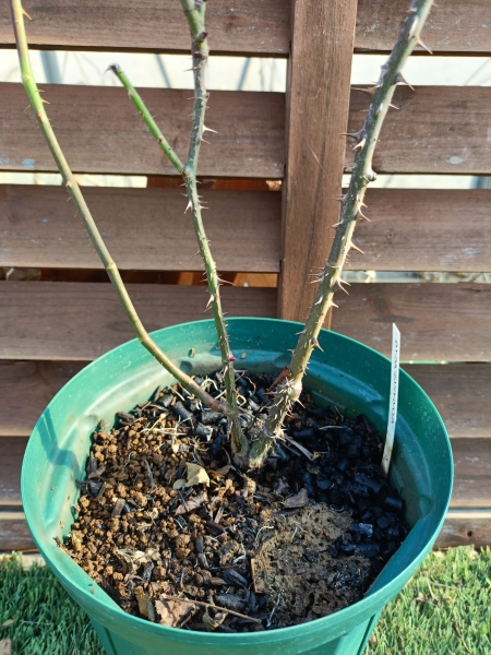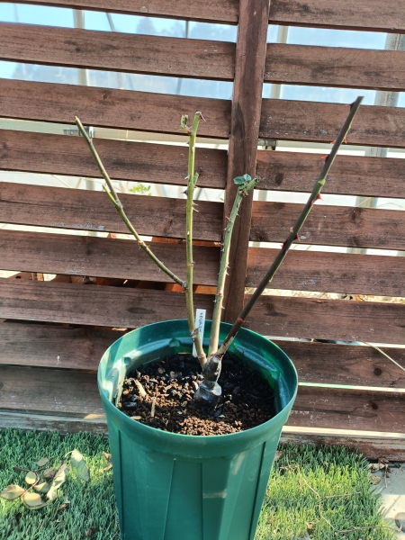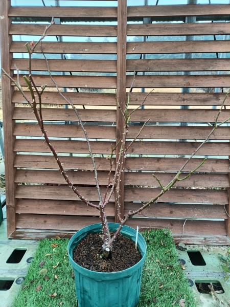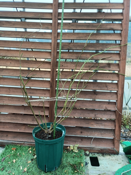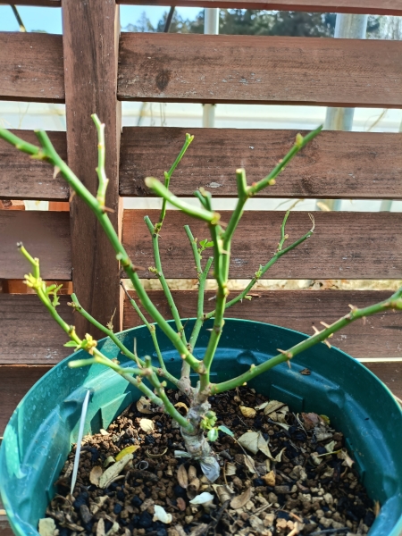 春の新苗を鉢増しして育てました。オールドブラッシュの枝替わりと言われています。そのまま楽しむより、切ってアレンジメントなどに使うと面白いバラです(12月27日撮影)