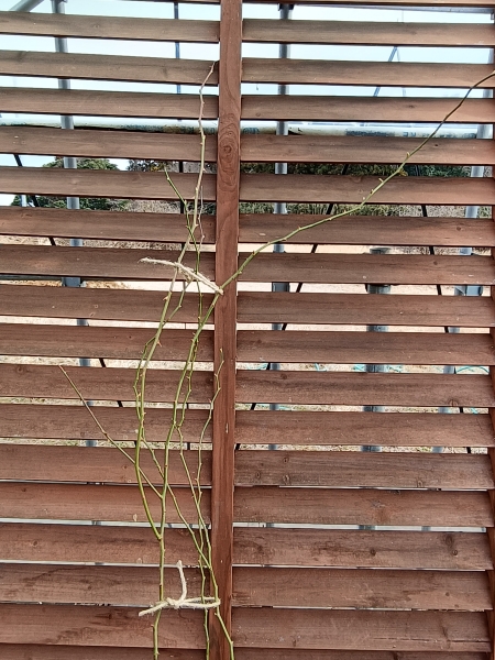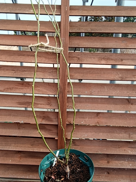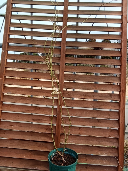 新苗から1年ほど育てた苗です。春だけの開花ですが、たくさんの白花を楽しませてくれます♪株元から3本のど長めの枝が伸びてます(2月20日撮影)