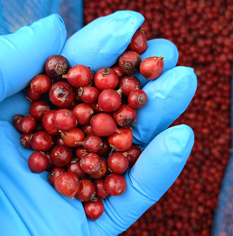 農場に地植えしているトゲナシノイバラから実を収穫して台木にします。